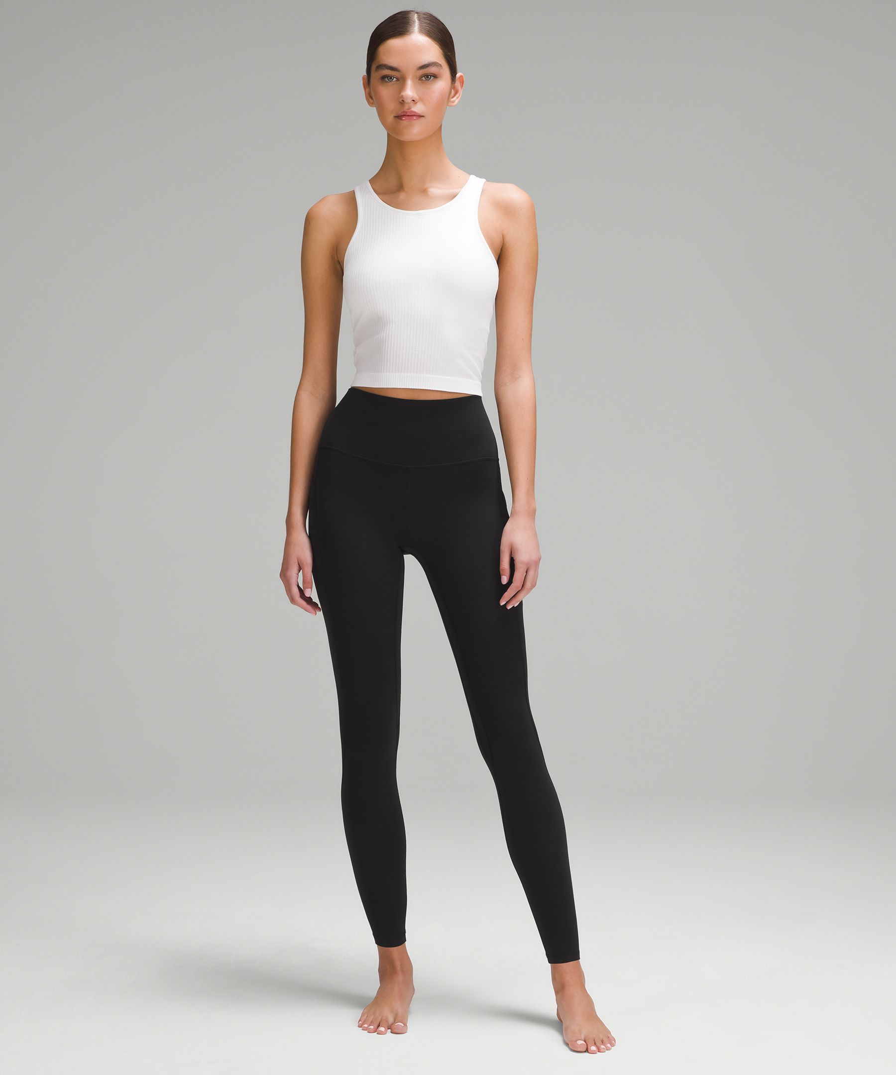 A high-rise waistband keeps you covered during forward folds and downward dogs. Our 31" length is intended to sit at your ankle.